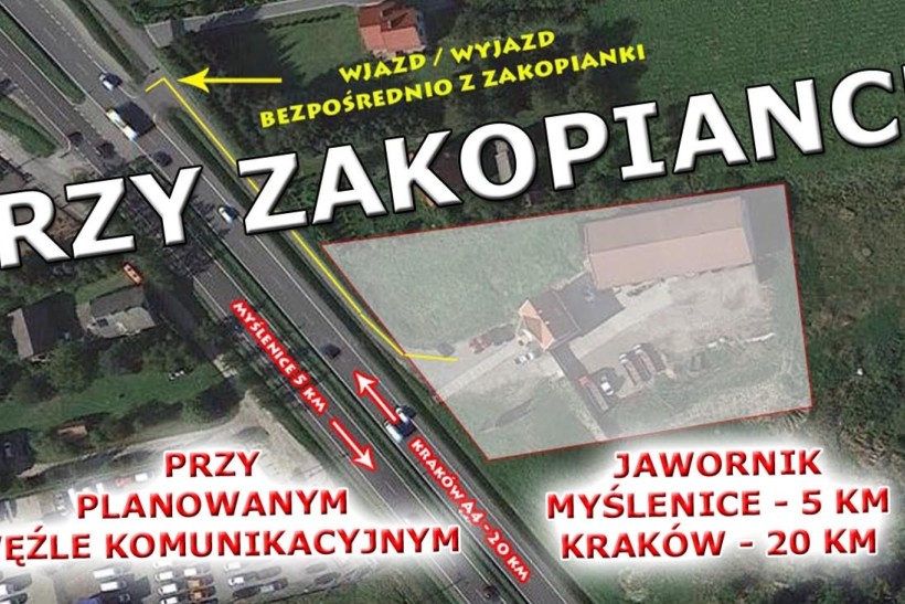 Nieruchomości znajdują się bezpośrednio przy drodze DK7, tzw. Zakopianka. Działka sąsiaduje z pasem drogowym drogi DK7. Obiekty są idealnie widoczne z Zakopianki od wejścia na biuro do Zakopianki jest około 40 m. Zarówno wjazd jak i wyjazd jest bezpośrednio z Zakopianki.