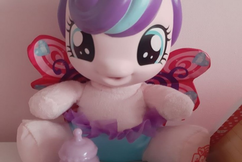 Kucyk mówi po polsku, reaguje na ruch, śmieje się i wydaje niemowlęce dźwięki.