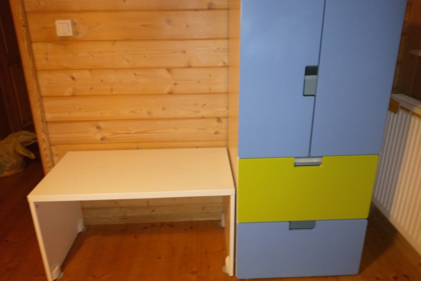 Meble do pokoju dziecięcego w bardzo dobrym stanie. W skład zestawu wchodzą: szafka z półkami i dwoma szufladami, stolik, dwie komody (po trzy szuflady) i skrzynia z wysuwaną dużą szufladą. Odbiór tylko osobisty w Dobczycach.