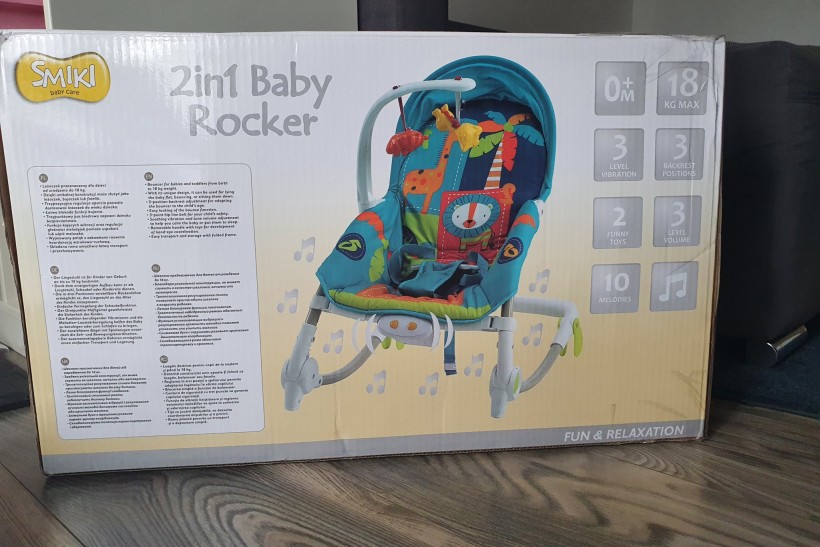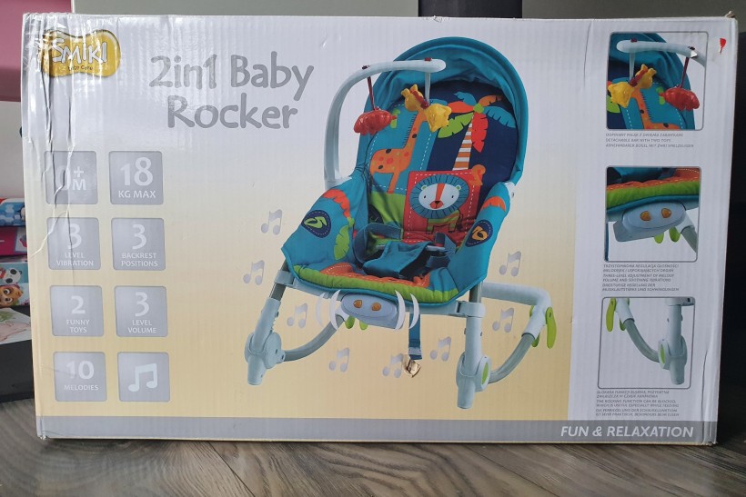 Nowy, zapakowany fabrycznie bujaczek firmy Smiki, 2w1 Baby Rocker, przeznaczony dla dzieci od 0 do 18 kg. Posiada urządzenie z 10 melodyjkami i 3 poziomami wibracji. Możliwość rozłożenia w 3 pozycjach w zależności od poziomu rozwoju dziecka. W zestawie znajduje się również odpinany pałąk z dwiema zabawkami.