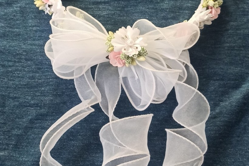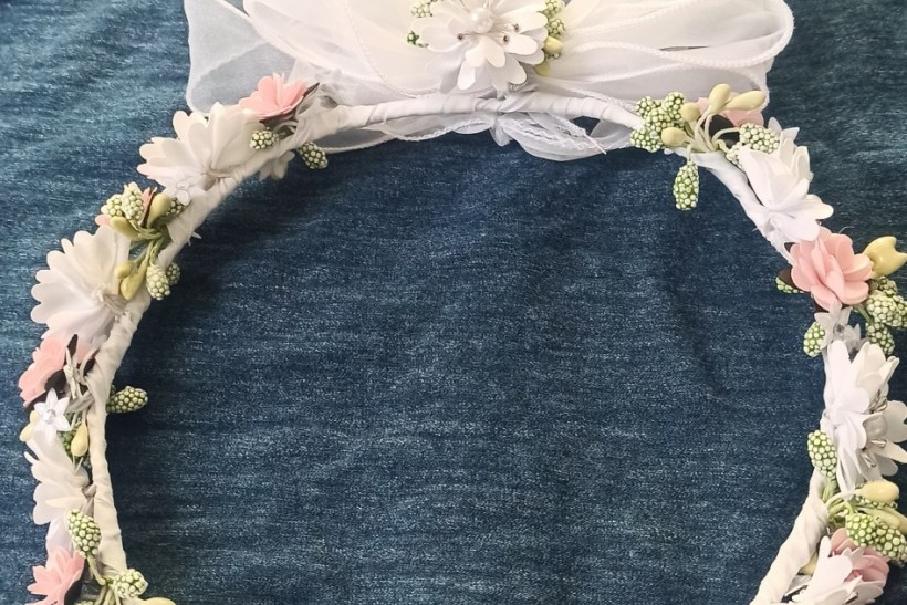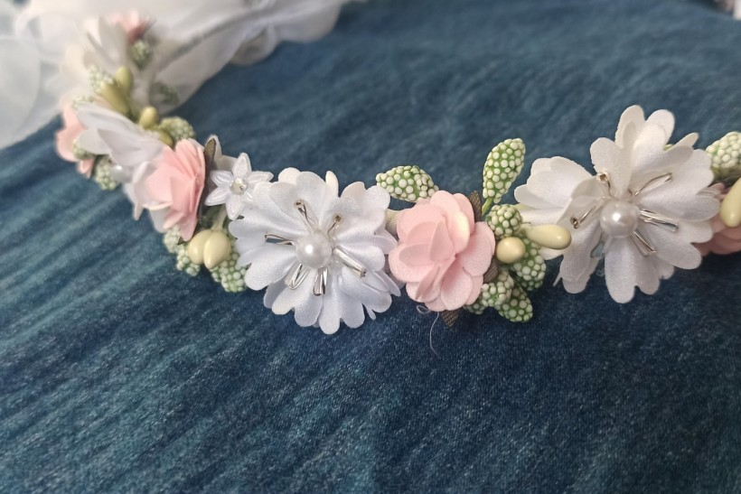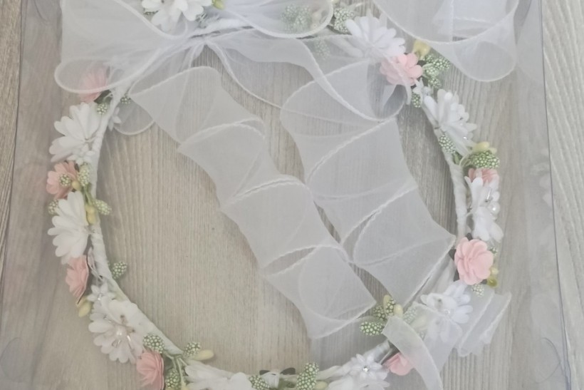 Największy kwiat biały we wianuszku ma 3cm średnicy. Wianuszek zapakowany w pudełku plastikowym.