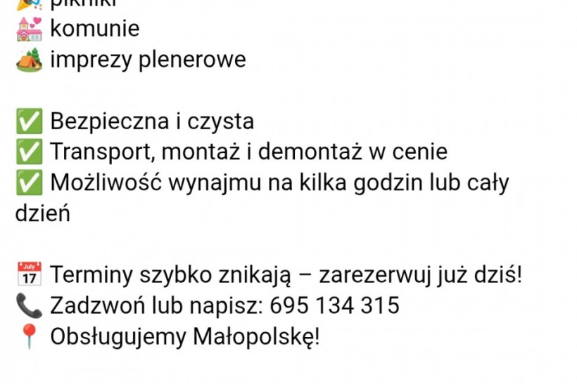 Myślenice i okolice dowóz ,rozłożenie i złożenie w cenie wynajmu. WOLNE WEEKENDY SIERPIEŃ/WRZESIEŃ