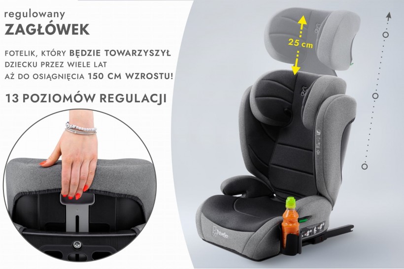 Fotelik posiada 13-stopniowy system regulacji zagłówka
