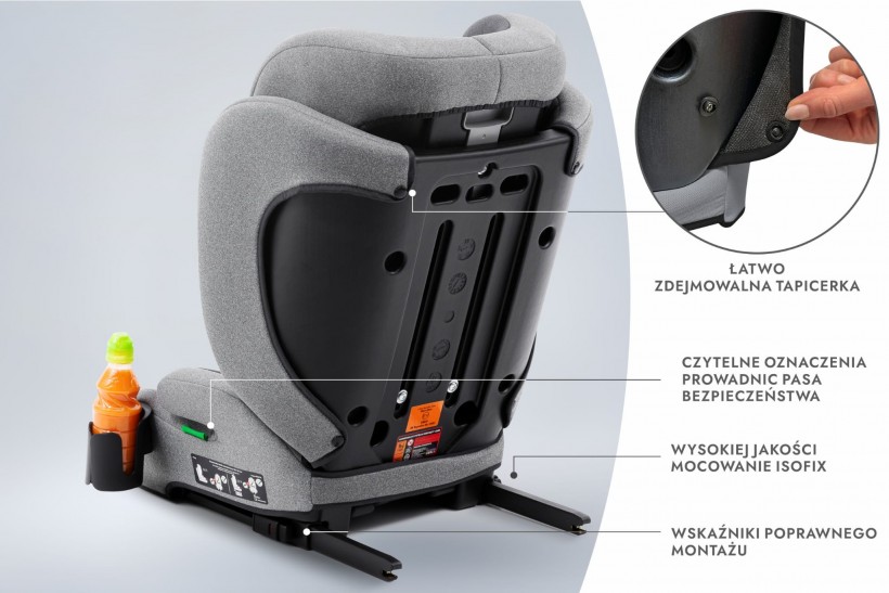 Tapicerka fotelika jest zdejmowana i nadaje się do prania w pralce bez użycia wybielaczy w temperaturze do 30°.