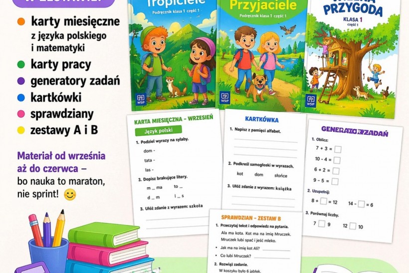 - karty miesięczne, generatory, kartkówki i sprawdziany z języka polskiego i matematyki