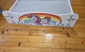 Sprzedam zestaw składający się z łóżka (łóżko, materac, stelarz, szuflada wolnostojąca) oraz szafki nocnej. Używane przez około dwa lata, posiada małe ślady użytkowania, materac czysty, niewygnieciony. Wymiary łóżka: 95szer 204dł 67wys cm Wymiary szafki: 41dł 32szer 48wys cm Odbiór osobisty w...