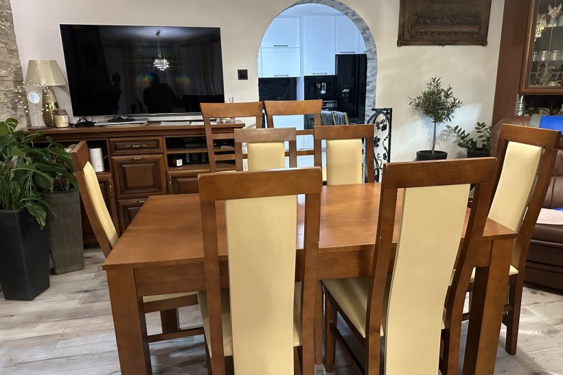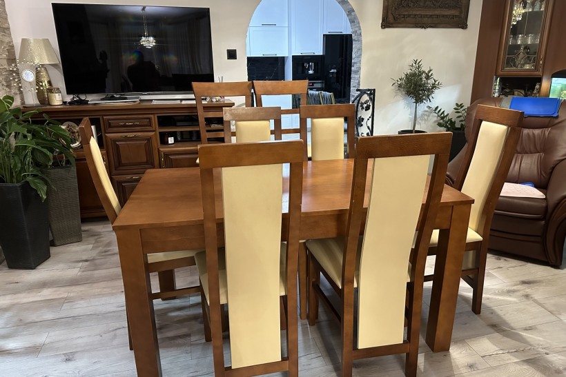 Stół z krzesłami 6 szt + 2 taborety wysokie do lady wymiary 140 * 80 cm