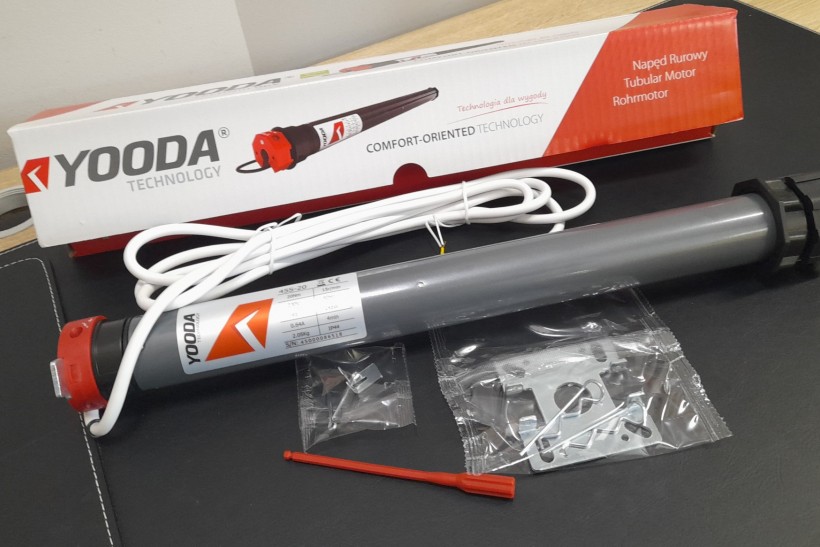 W skład kompletu wchodzi: silnik rurowy YOODA 45S 20Nm + uchwyt/ adapter + instrukcja obsługi