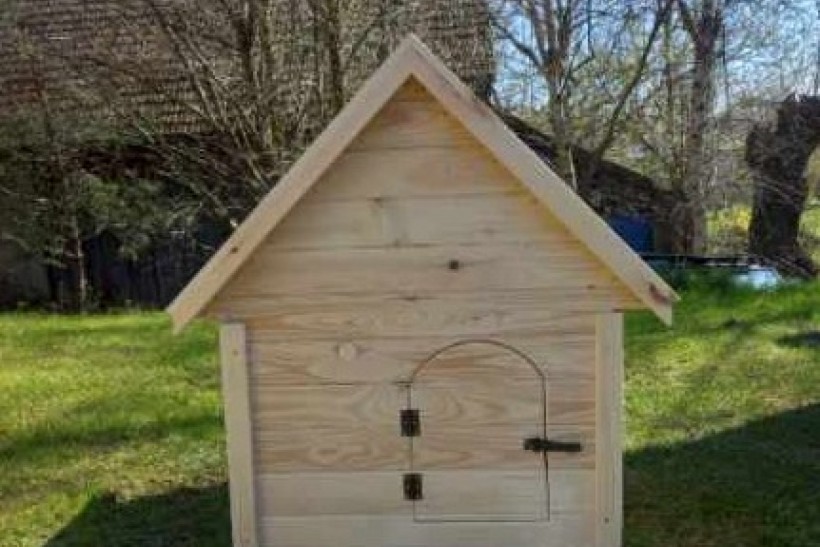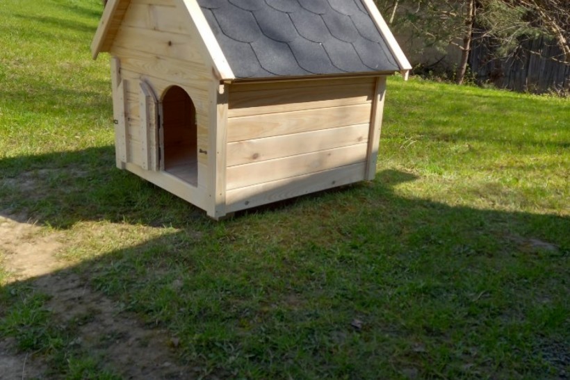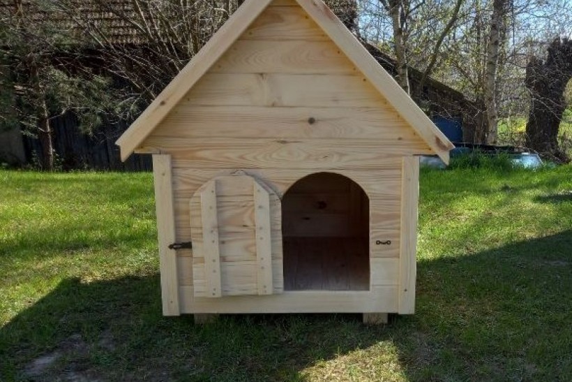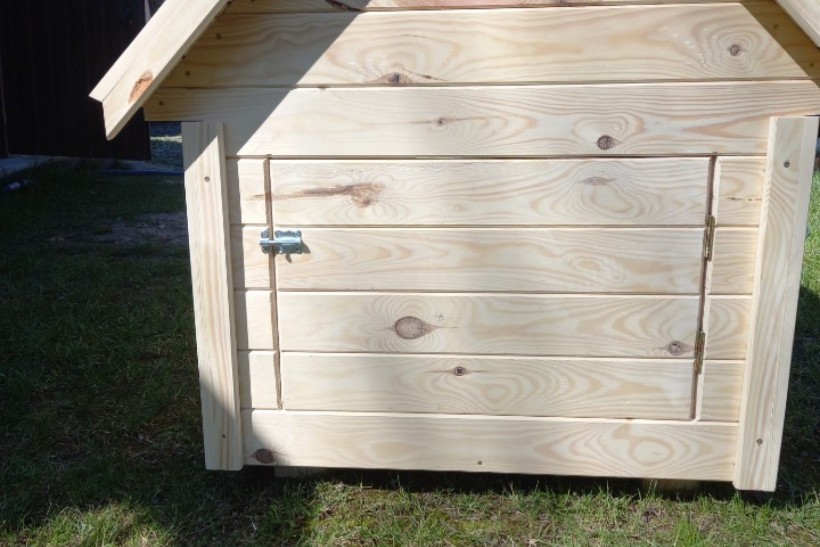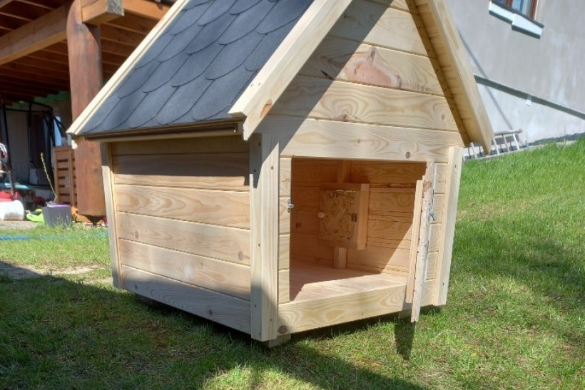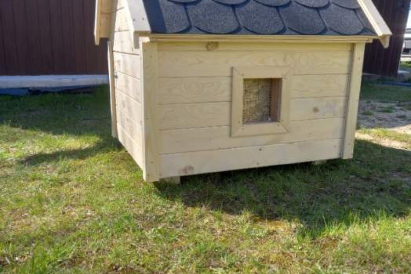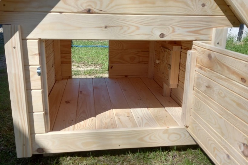 Domek wykonany z suszonego drewna. Podbitka grubości 2 cm, w środku konstrukcja z kantowki oraz płyty OSB.