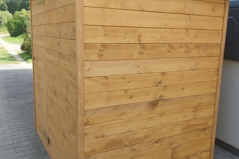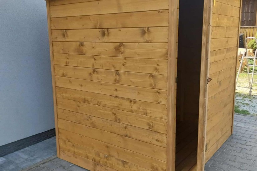 Drewniany domek narzędziowy.