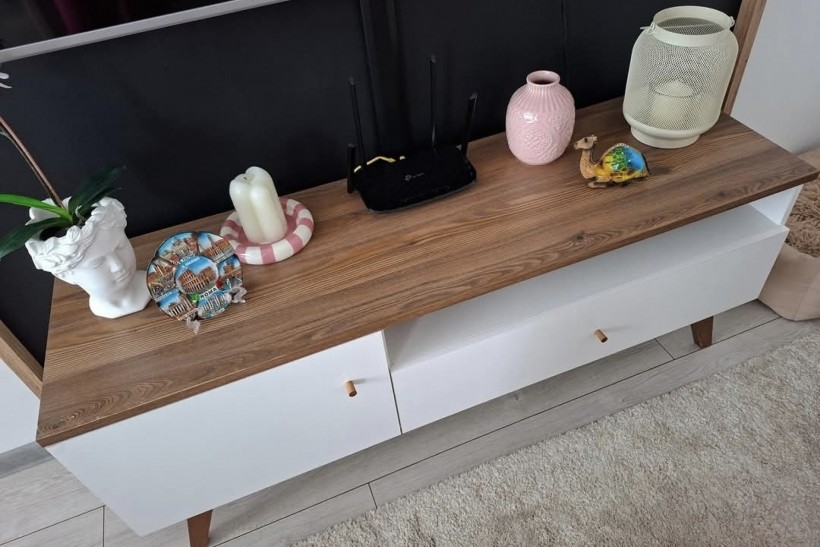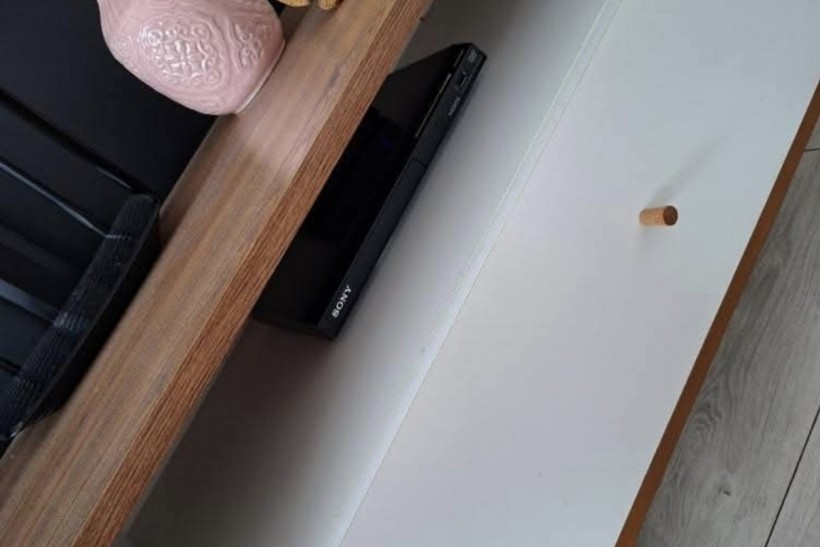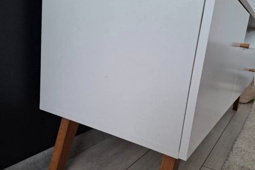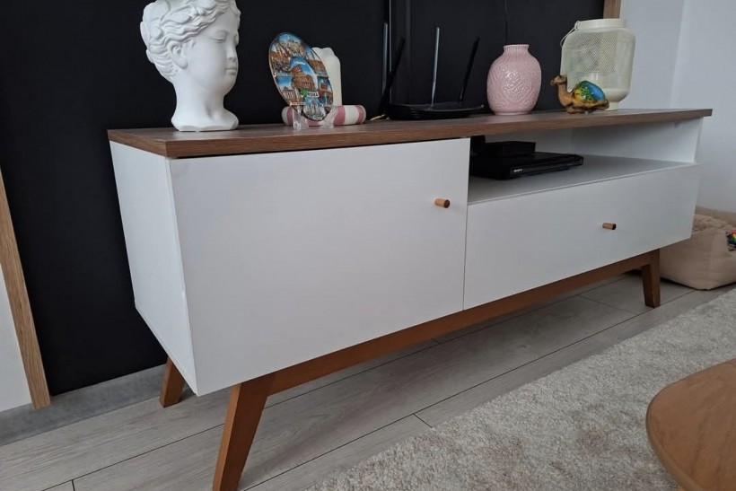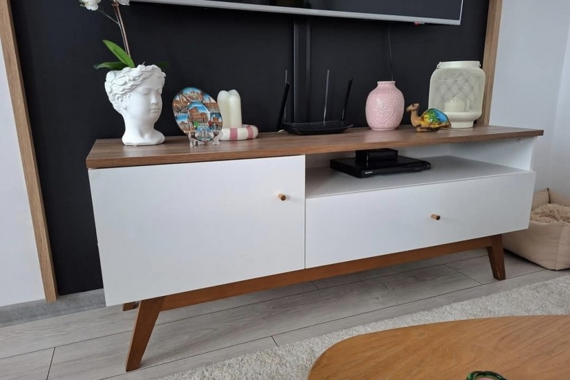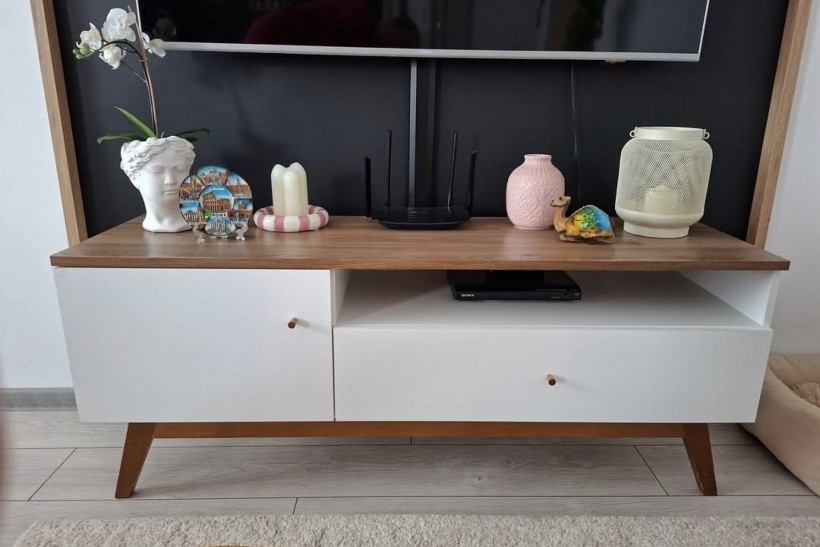 Sprzedam szafke RTV kolor drewna z bielą. Wys.50cm, dł.135cm, głęb.40cm. Szafka posiada wnękę z oryginalnym otworem na kable, pojemną szufladę, do ktorej tez można pokierować kable ewentualnie i pojemną szafkę. Ma solidne nożki na belkach. Zadbana.