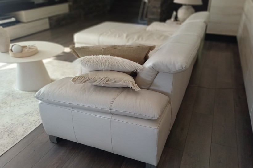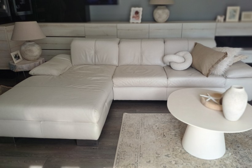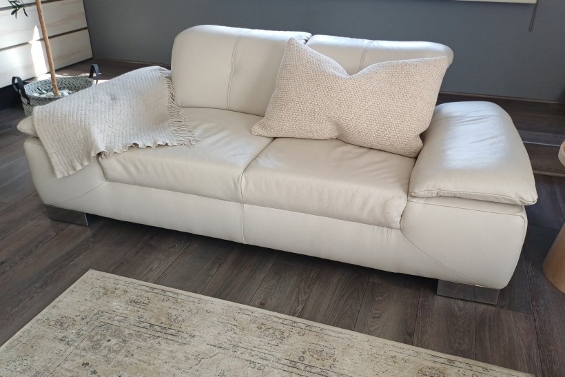 Sofa jest używana w b.dobrym stanie wykonana z najwyższej jakości grubej i miękkiej skóry, charakteryzuje się odpornością wytrzymałością, podczas użytkowania była regularnie czyszczona i impregnowana. Sofa jest w kolorze ecru. Kupiona w polskim salonie wyprodukowana w Belgii.