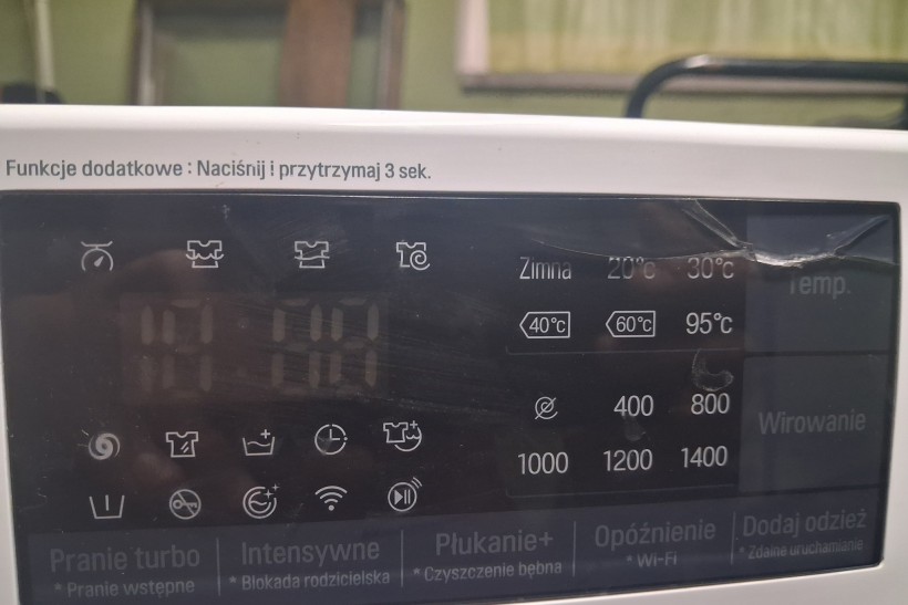 Wymiary pralkosuszarki: wysokość - 84 cm, szerokość - 60 cm, głębokość - 58 cm. Pralka posiada silnik inwertorowy (bezszczotkowy). Programy i opce są widoczne na zdjęciach.