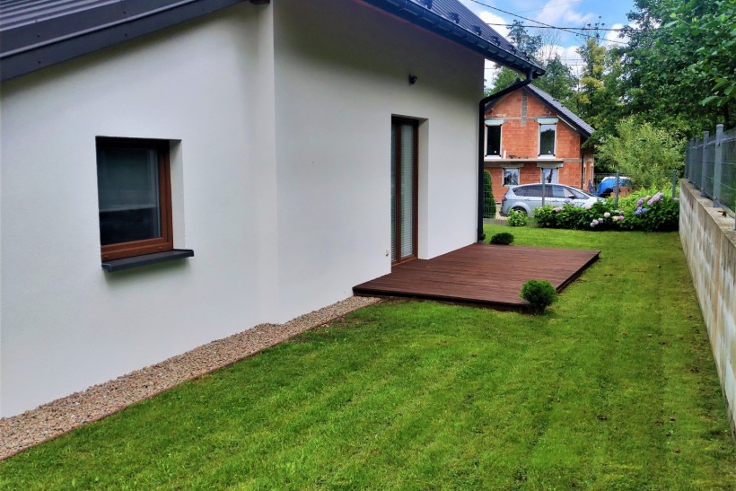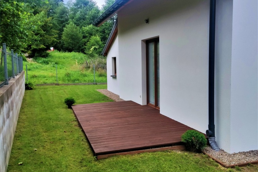 Z salonu na parterze można wyjść na taras, który jest wyłożony deskami tarasowymi.