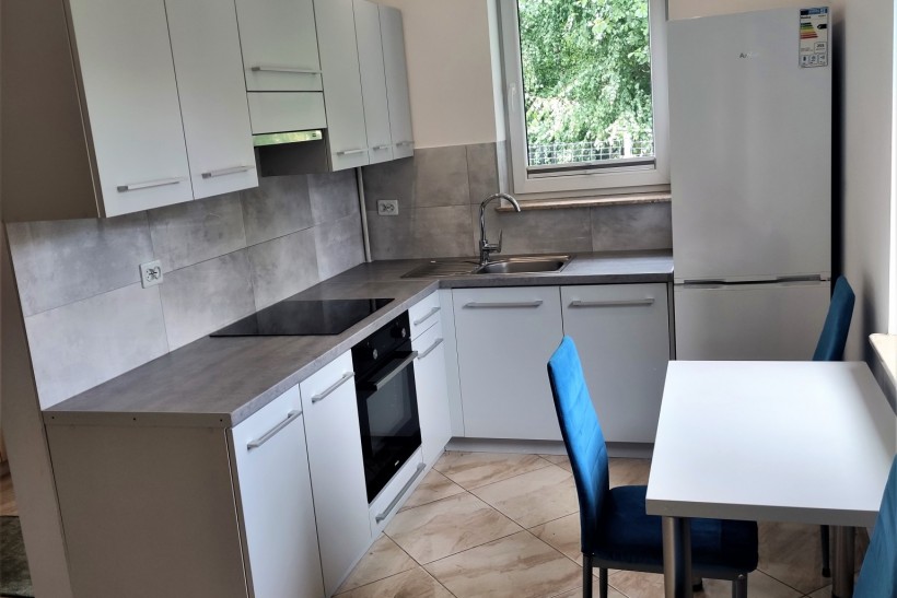 Kuchnia wyposażona jest w płytę elektryczną, lodówkę, zmywarkę, piekarnik, okap. W kuchni znajdują się meble robione na wymiar (bez zastawy kuchennej) oraz stół z 3 krzesłami.