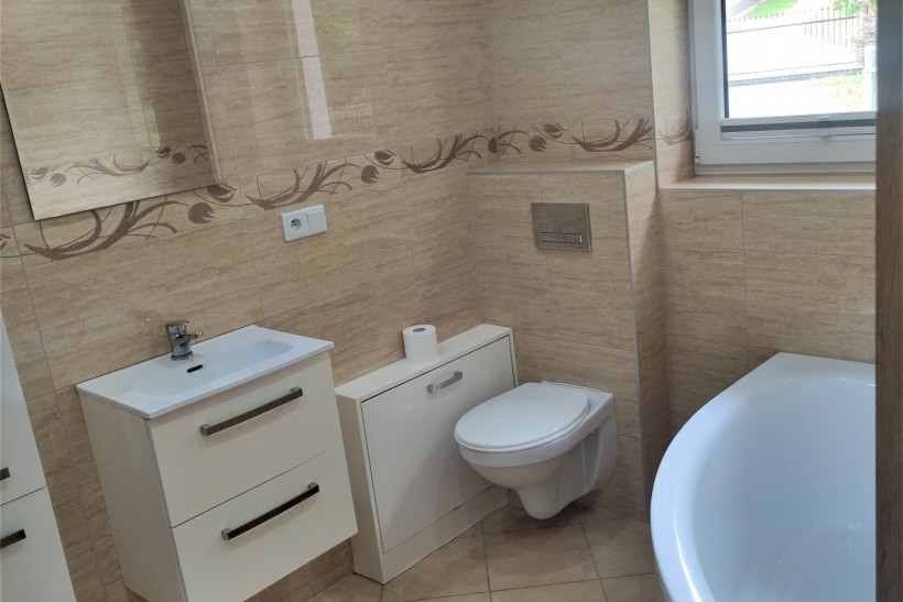 Duża i przestronna łazienka posiada prysznic oraz wannę, toaletę, pralkę, szafkę z umywalką, lustro, szafką na kosmetyki oraz piec gazowy.