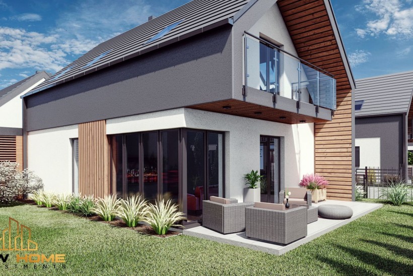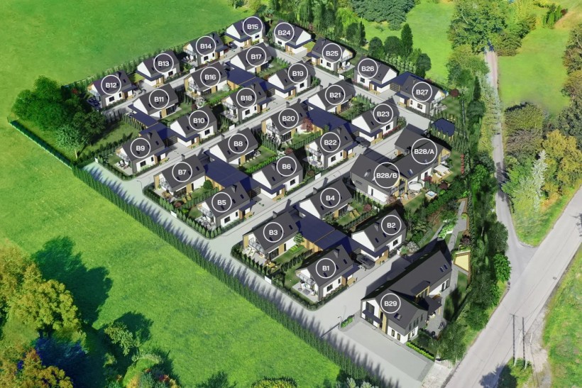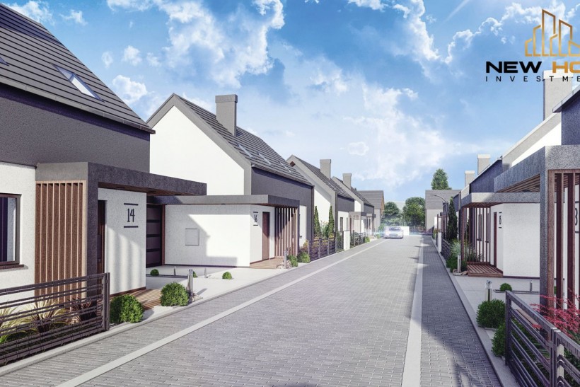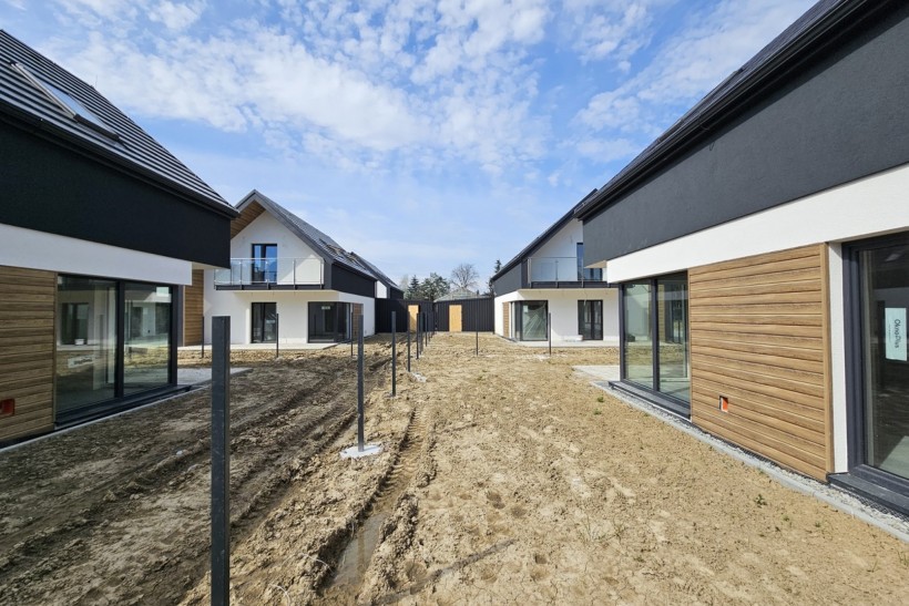 Nowoczesne budynki mieszkalne mają pow. użytkową ok. 79m2 i wykończone zostały do stanu deweloperskiego, do każdego z nich przynależy niewielki, ale w zupełności wystarczający ogródek. Miejsca postojowe w wiatach garażowych, dodatkowo przy niektórych budynkach powstały wiaty ogrodowe pozwalające na przechowywanie niezbędnego sprzętu.