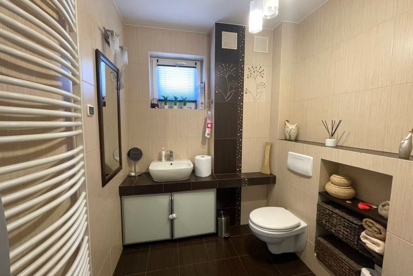 Dom wyposażony został w nowoczesne udogodnienia: ogrzewanie olejowe, instalację fotowoltaiczną, klimatyzację, szambo oraz studnię głębinową, co zapewnia niezależność i niższe koszty eksploatacji.