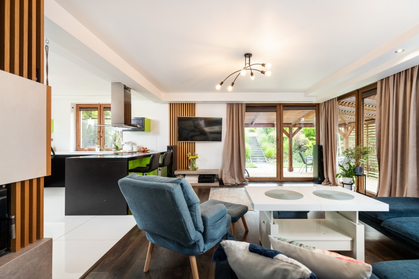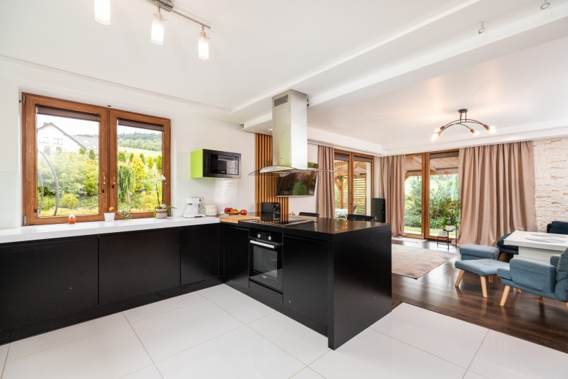 - Światło, przestrzeń i widok – dzięki dużym przeszkleniom i narożnym oknom z wyjściem na taras każde pomieszczenie zyskuje wyjątkowy klimat