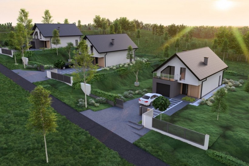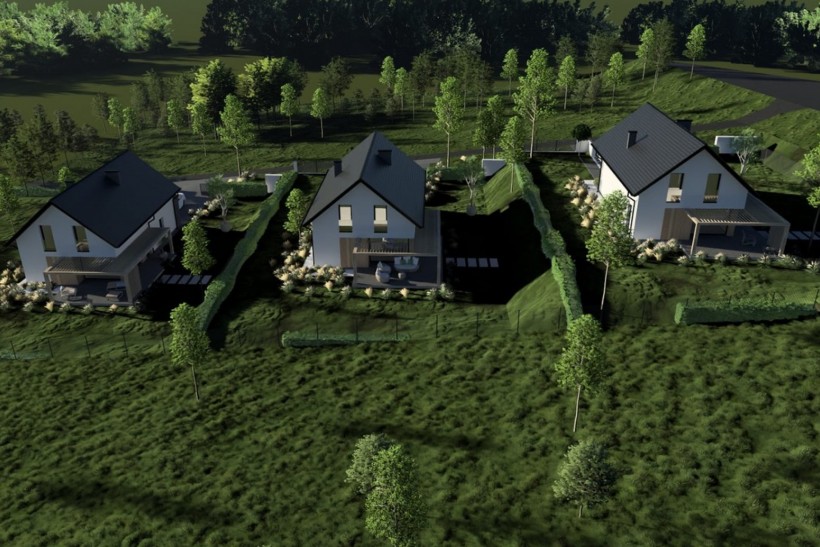 Domy powstają na trzech optymalnych działkach o powierzchni 962m2, 882m2, 1235m2.