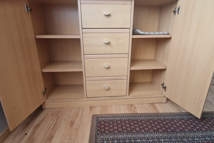 Praktyczna komoda z szufladami i drzwiami, wykonana z drewna. Mebel w stanie używanym, może posłużyć jako funkcjonalne i pojemne miejsce do przechowywania ubrań lub innych przedmiotów. Pasuje do wielu aranżacji wnętrz.Wymiary komody : wys 86, dl 110, głębokość 33