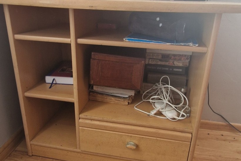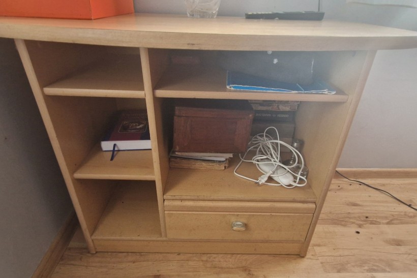 Szafka pod telewizor. Posiada półki oraz szufladę, co pozwala na wygodne przechowywanie różnych przedmiotów. Mebel w dobrym stanie, nadaje się do użytku w każdym pomieszczeniu.