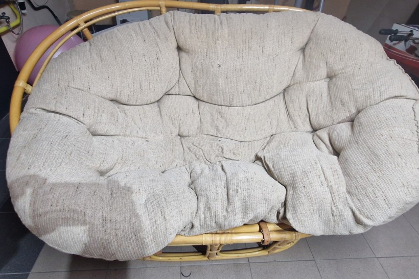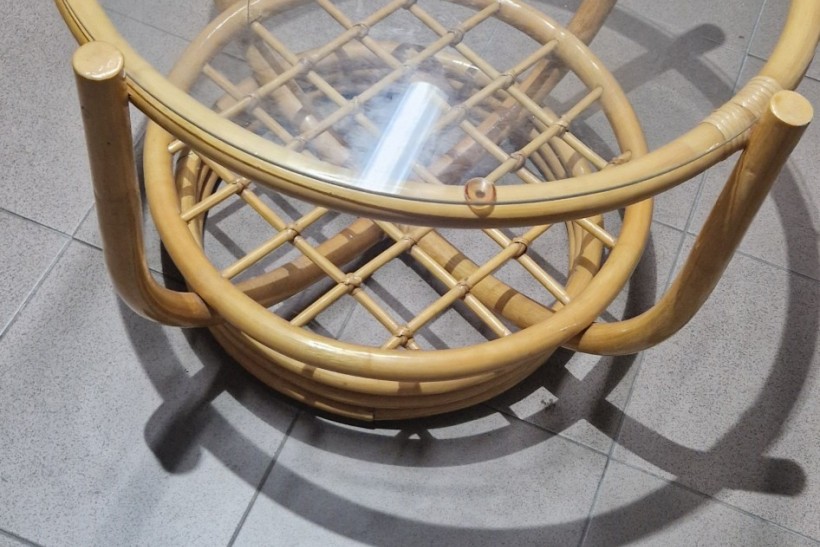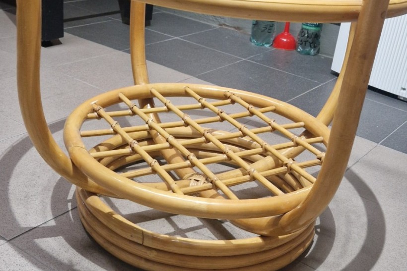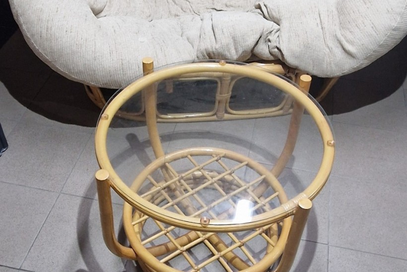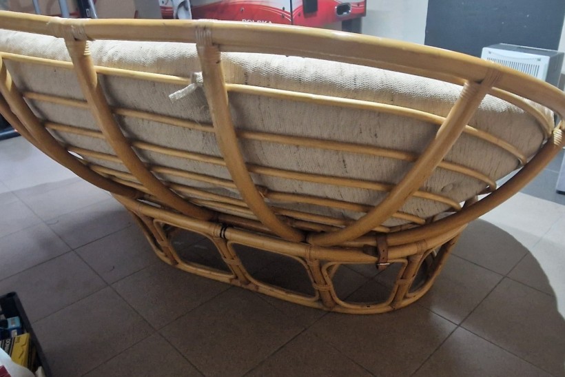 Wygodne, używane łóżko rattanowe z miękkim, kremowym siedziskiem. Mebel w dobrym stanie, nadaje się do użytku w domu lub na tarasie. Solidna konstrukcja z naturalnego materiału zapewnia trwałość i estetyczny wygląd. Stół w bardzo dobrym stanie.