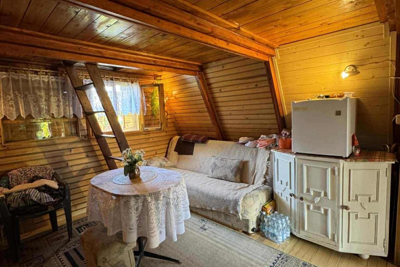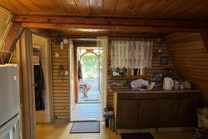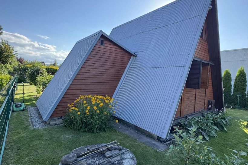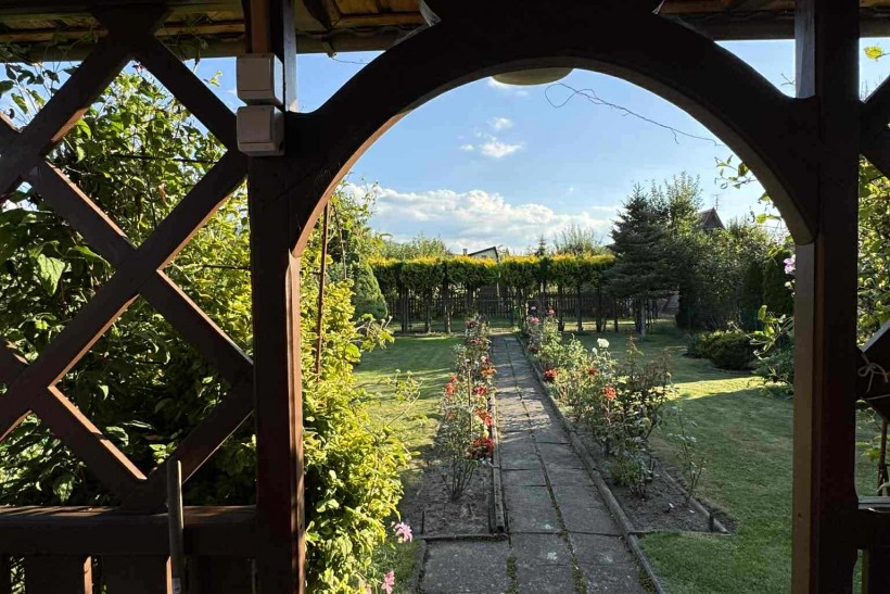 Na działce znajduje się drewniany domek z dobudowaną altaną, solidnie zadaszoną i oświetloną, idealną do spędzania letnich wieczorów.