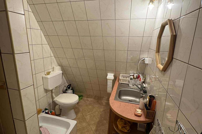 Parter: przestronne pomieszczenie ok. 20 m² z aneksem kuchennym, prysznicem z brodzikiem i WC.