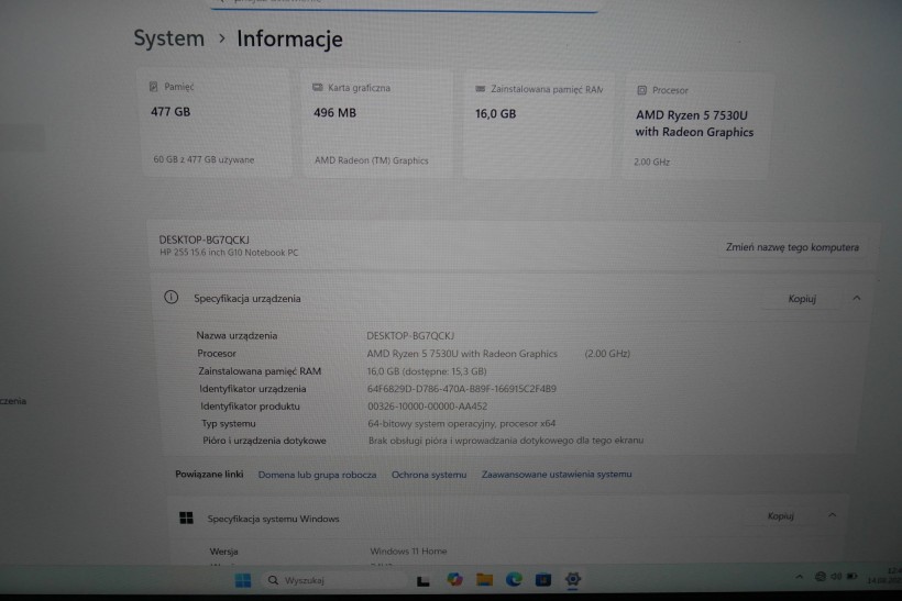 Laptop HP 255 G10 Ryzen5/16GB/SSD512/W11 22M GW Prawie Nowy