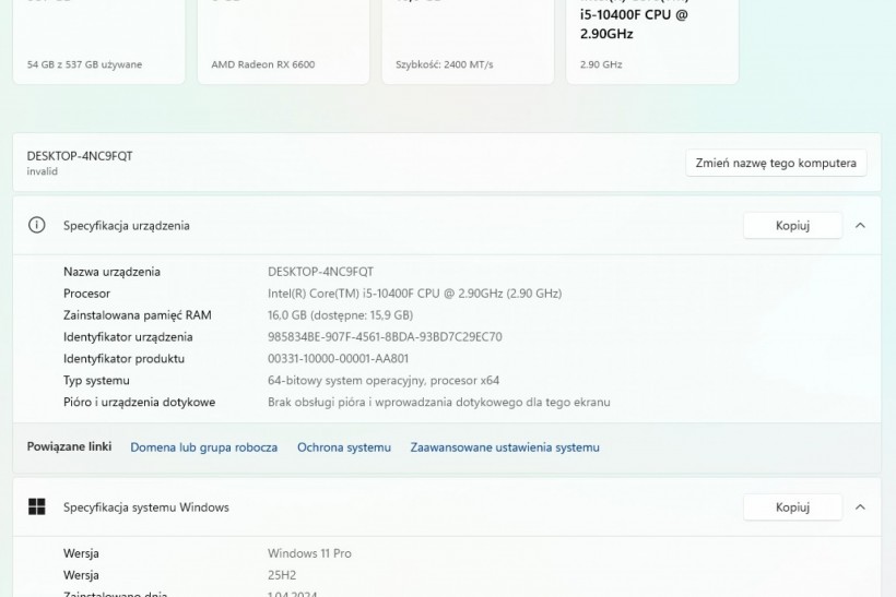 Komputer w pełni sprawny, o bardzo wydajnych podzespołach pozwalający zagrać w każdą nową grę w rozdzielczości 1920x1080 i wysokich detalach. Dzielnie służył do gier i projektowania od około 4-5 lat. Karta graficzna to PowerColor Radeon RX 6600 Hellhound 8GB, która wydajnościowo jest na poziomie RTX 3060, a pobiera dużo mniej prądu (można sprawdzić na YouTube). Karta jest bardzo cicha i w idealnym stanie, wręcz sklepowym (oryginalna plomba, karta nierozkręcana, mam pudełko). Ma podświetlane na niebiesko wentylatory. Procesor to i5-10400F, czyli procesor 10 generacji posiadający 6 rdzeni i 12 wątków. Jest chłodzony przez chłodzenie SilentiumPC Spartan 4 100mm. Pamięć RAM to 16GB o taktowaniu 2400MHz w dwóch kościach. Dwa podzespoły w komputerze są nowe, a mianowicie: