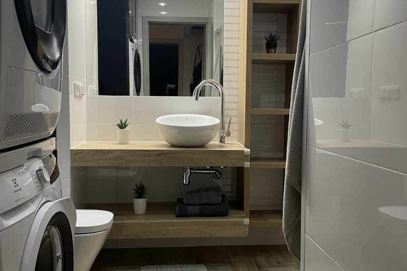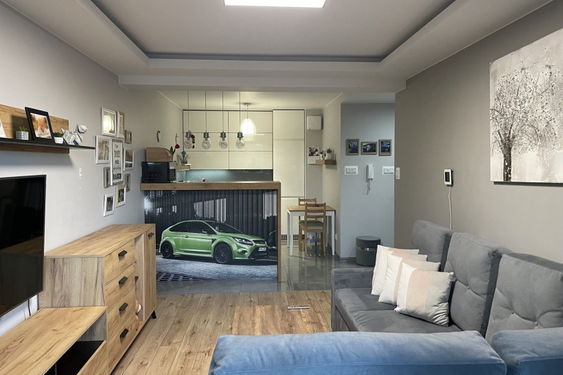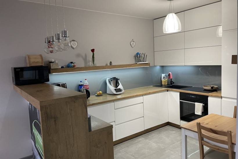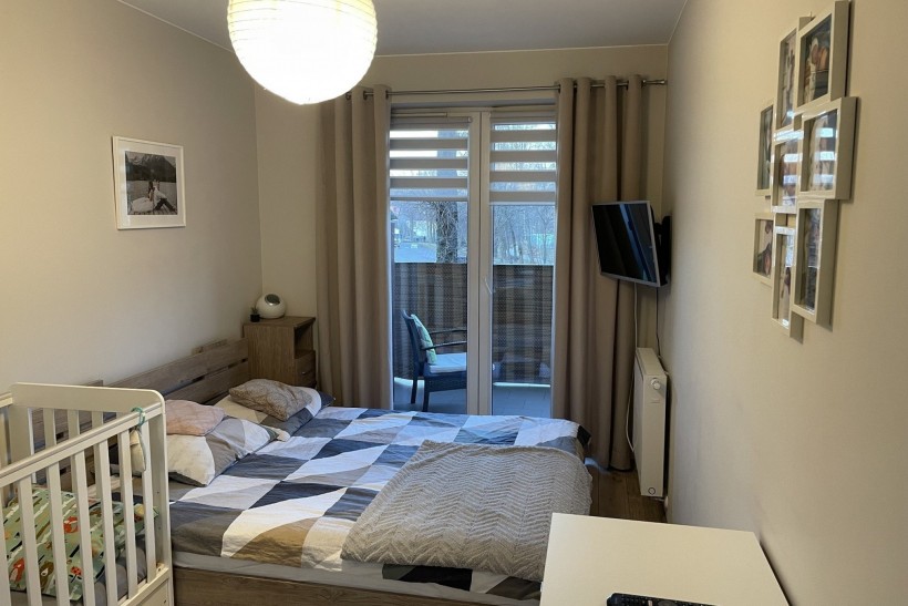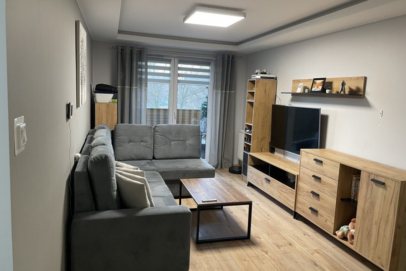 Nowoczesne mieszkanie o powierzchni 50 m2 usytuowane jest na 1 piętrze, składa się z salonu z aneksem kuchennym, sypialni i łazienki. Dodatkowo do mieszkania jest komórka lokatorska. Mieszkanie odświeżone, w pełni umeblowane i wyposażone w sprzęty AGD. W budynku znajduję się pomieszczenie z bilardem, stołem pingpongowym. Możliwość wynajęcie miejsca w garażu podziemnym cena 400 zł.