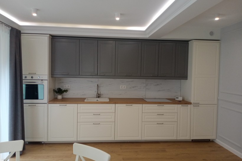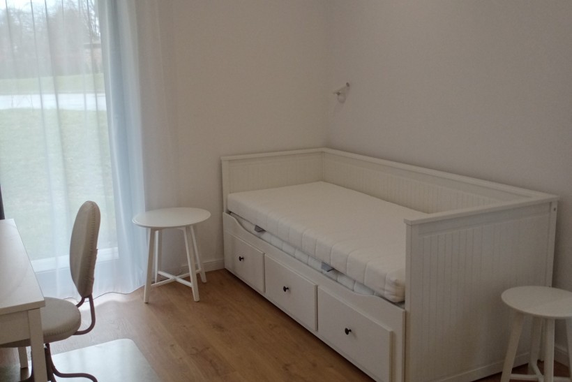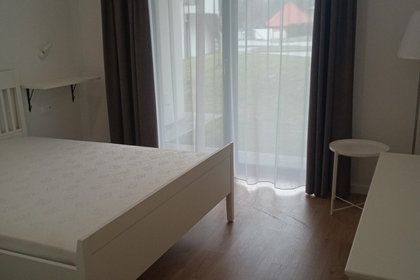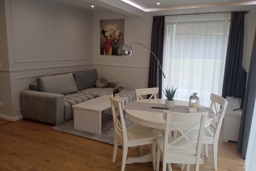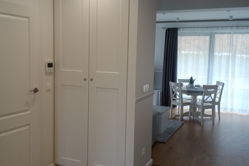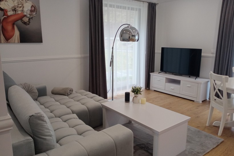 Piękne nowe mieszkanie o powierzchni 68 m2 usytuowane jest na parterze, składa się z salonu z aneksem kuchennym, dwóch sypialni i łazienki. Salon z kuchnią oraz łazienka w pełni wyposażone jak na zdjęciach. Jedna sypialnia wyposażona w łóżko sypialniane, szafę oraz komodę, druga sypialnia zawiera łóżko rozkładane dwuosobowe. szafę i biurko. W przedpokoju znajdują się dwie szafy.