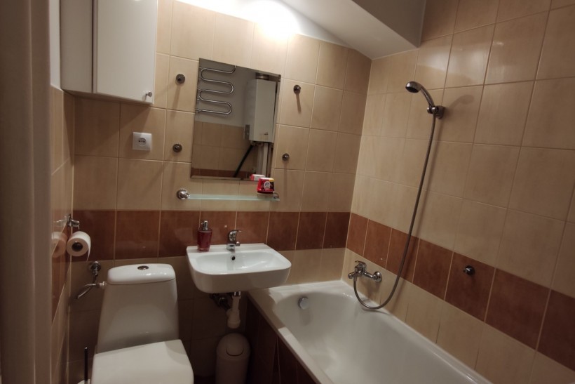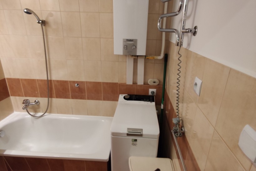 Łazienka: wanna, WC, umywalką, pralka, szafka oraz piecyk gazowy.