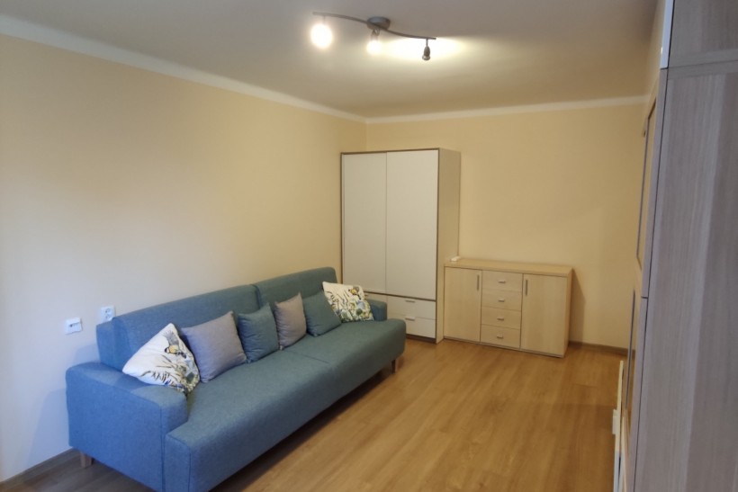 Pokój: szafa, stolik, kanapa z funkcją spania, dwa regały, dwie komody [mała i duża], okna i drzwi balkonowe z roletami (UWAGA: mieszkanie nie posiada balkonu).