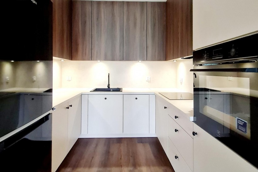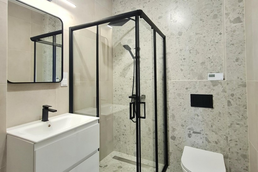 W mieszkaniu wyposażona łazienka z wc i kabiną prysznicową oraz kuchnia w której znajdują się meble, zmywarka, płyta indukcyjna, zlewozmywak, lodówka.