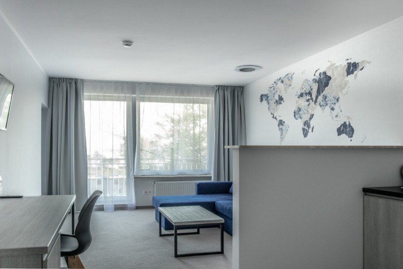 Jako jedyni posiadamy apartament z oddzielną zamykaną sypialnią, a także salon z rozkładanym narożnikiem dla dwóch osób, aneksem kuchennym, łazienką, przedpokojem i przestronnym balkonem z urzekającym widokiem na Jezioro Jamno.