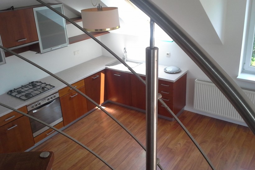 4-pokoje z balkonem i piwnicą (po podłogach ok.75m2) cena 780 000, dół -pokój dzienny z aneksem kuchennym, przedpokój z garderobą, pokój, łazienka, góra -przedpokój, sypialnia z garderobą i pokój. Czynsz 200zł plus opłata za wodę