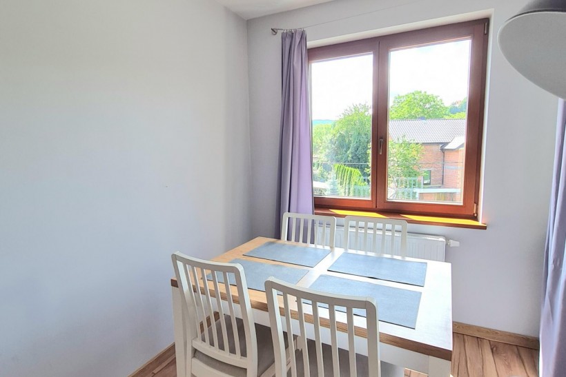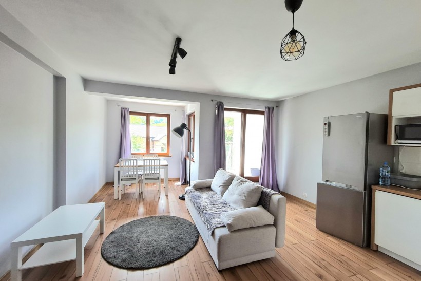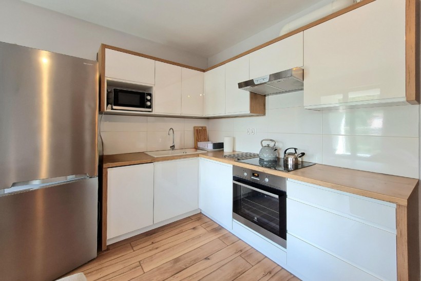 Mieszkanie jest w pełni urządzone i wyposażone w sprzęt AGD (lodówka, zmywarka, płyta indukcyjna, kuchenka mikrofalowa i pralka).