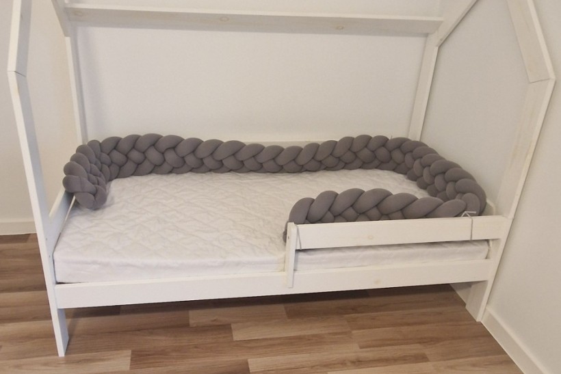 Stylowy, drewniany domek dziecięcy z materacem i warkoczową dekoracją. Doskonałe rozwiązanie na wygodną i bezpieczną przestrzeń do snu dla Twojego malucha.