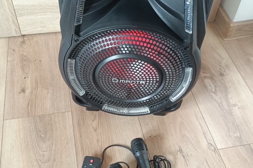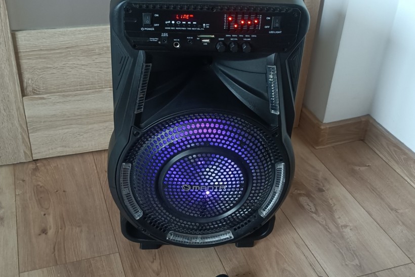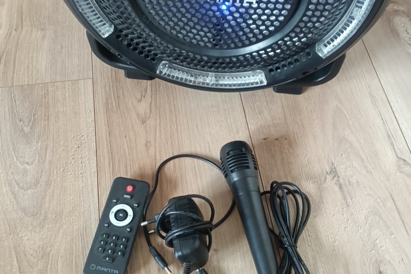 Głośnik manta spk 5033 kupiony w zeszłym roku głośnik używany gra bardzo dobrze dźwięk podświetlenie działa jak powinno baterią trzyma w zestawię głośnik pilot mikrofon ładowarka powinienem mieć jeszcze papiery od niego jeśli znajde karton jeśli nie opakowanie zastępcze
