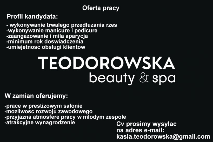 Zatrudnię samodzielną kosmetyczkę do pracy w salonie Beauty&Spa w Myślenicach. Szukam osoby umiejącej robić paznokcie żelowe lub/i przedłużanie i zagęszczanie rzęs.