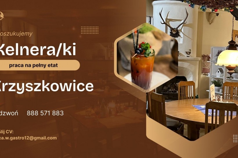 Restauracja w Krzyszkowicach zatrudni Kelnera/Kelnerkę do pracy na pełny etat. Doświadczenie będzie dodatkowym atutem. Praca co drugi dzień.