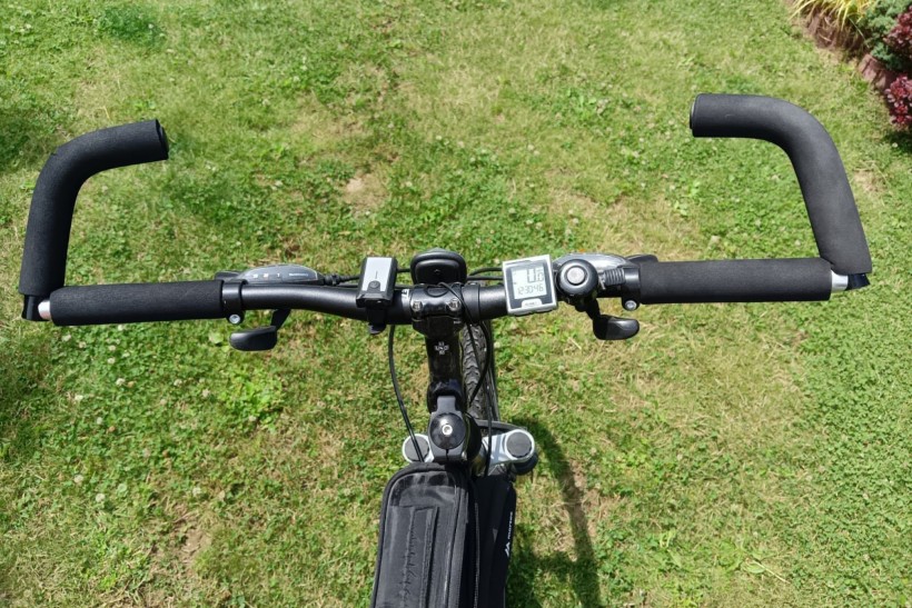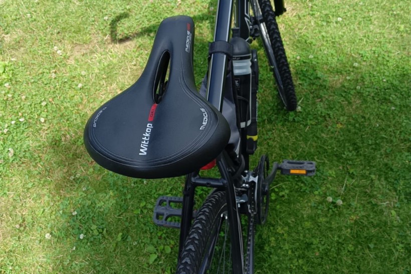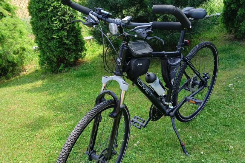 Dodatkowo do rowera dołożone są lampki bardzo mocne, licznik, rogi przy kierownicy, miękkie uchwyty kierownicy, bidon, pompka, sakiewka pod ramowa, sakiewka na telefon + dwa schowki, siedzenie nieodparzające, oryginalne siedzenie gratis. Rower zakupiony w hurtowni w Myślenicach.