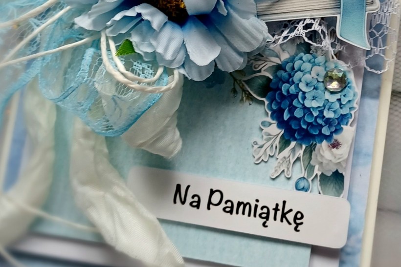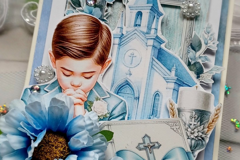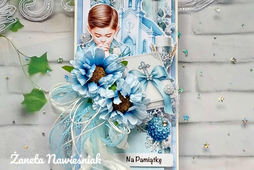 Kartka hand made- pamiątka z okazji Pierwszej Komunii Świętej, kartka w formacie DL, zapakowana w pudełko z okienkiem, w środku do samodzielnego wypisania, dla chłopca. Odbiór osobisty Mszana Dolna lub wysyłka za dopłatą.