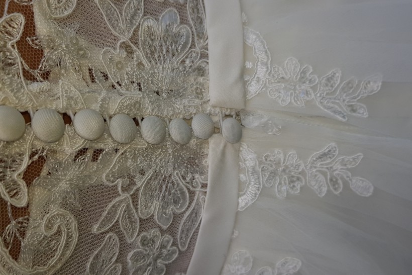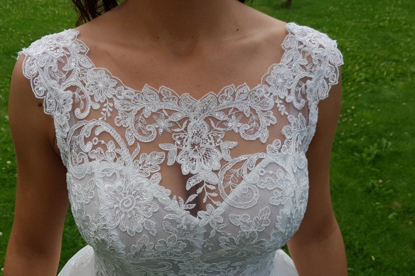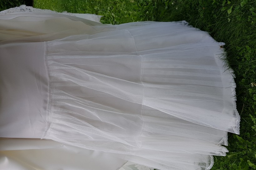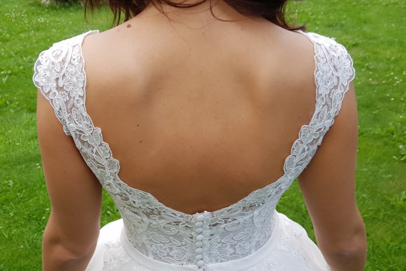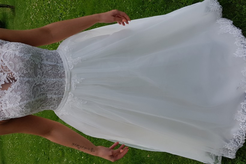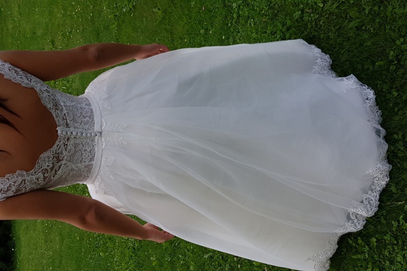 Sukienka w kolorze śmietanowym, idealnie pasuje dla osób z nieco ciemniejszą karnacją. Pod koronką na klatce piersiowej wszyte są sylikonowe taśmy, które powodują, że koronka nie gryzie. Są również zrobione zastawki na ramiaczka do stanika, aby byla pewność, że nic nie będzie widać. Gorset połtransparentny - musi być cielisty biustonosz. Suknia jest na halce biodrówce na niewielkim kole. Plecy są pieknie wyeksponowane. Zapiecie jest na zamek, wiązanie, haftki oraz guziki dlatego nie ma mowy, żeby coś się poluzowalo. Aktualnie przechowywana jest w oryginalnym pokrowcu. Świetnie się prezentuje nie tylko podczas tańca, ale i w całej okazałości. Bylam z niej bardzo zadowolona. W ogóle nie zniszczona mimo, że miałam ja na sobie 2 razy - ślub i sesja ślubna. Suknia była wyprana w pralni ekologicznej po ślubie - po sesji jeszcze nie. Chętnie dołożę do tego ozdobę do włosów i srebrne kolczyki, które świetnie pasuja do sukienki - były dobrane również w Sabe.