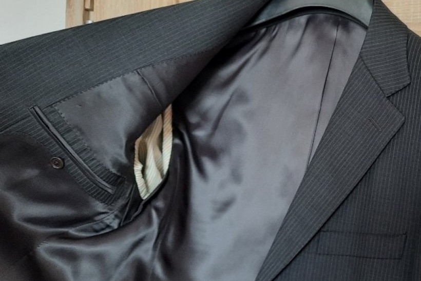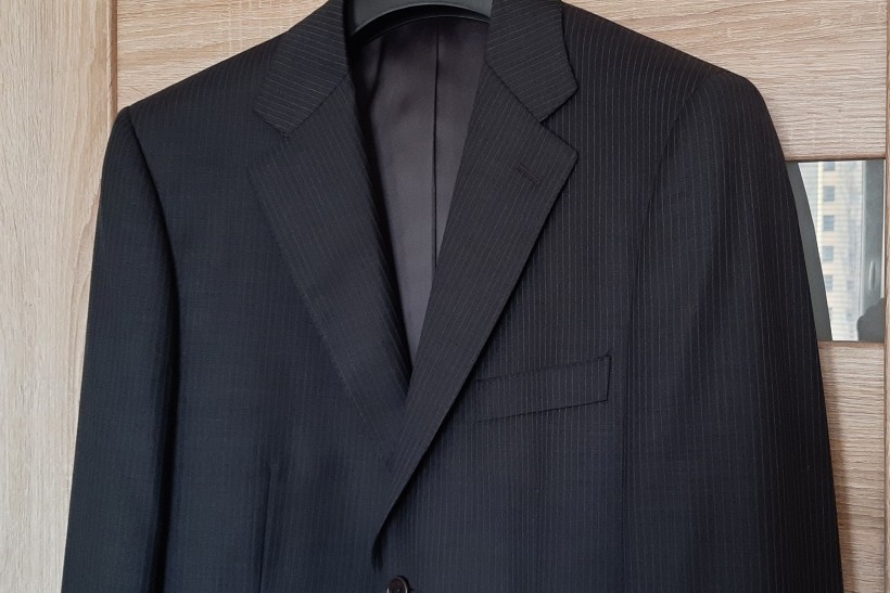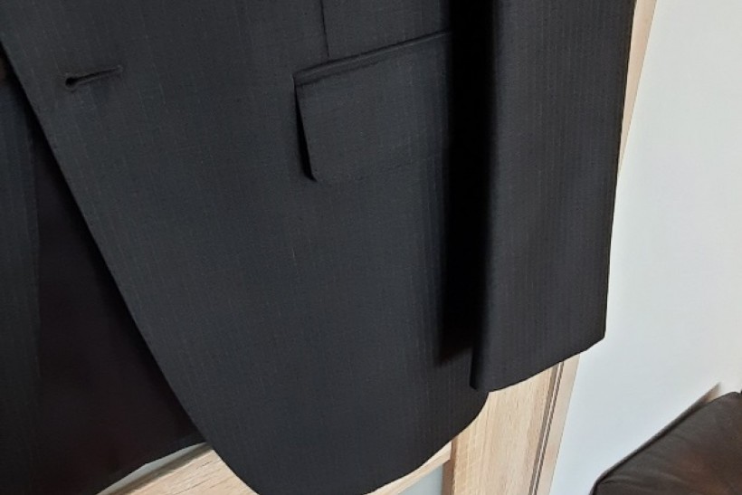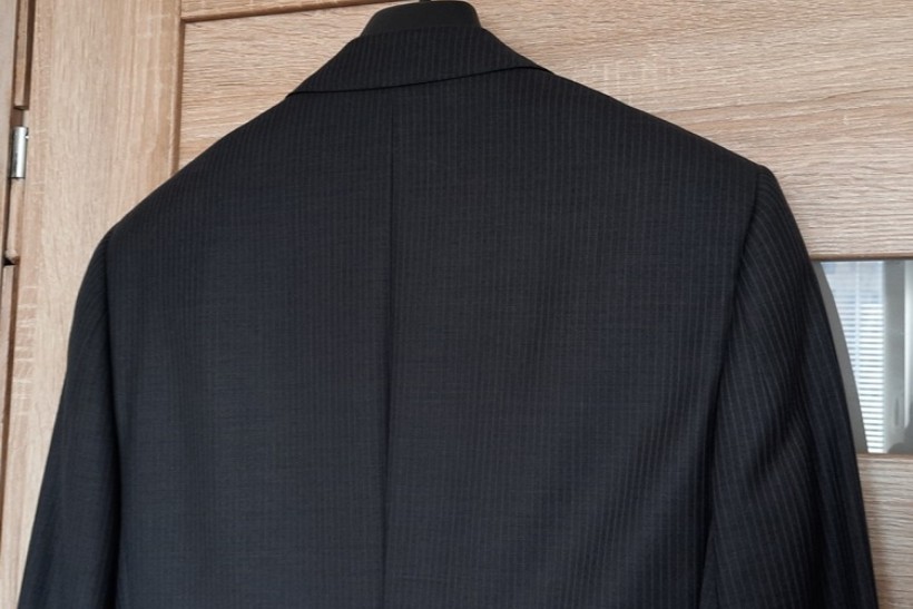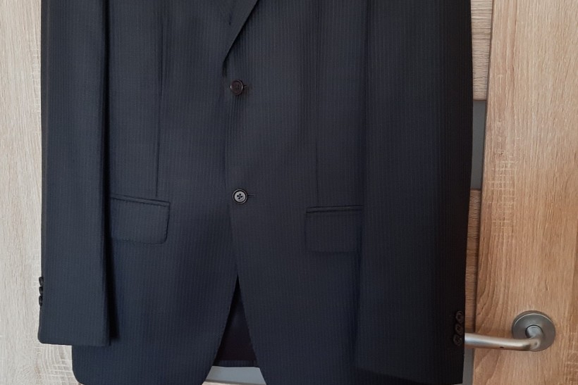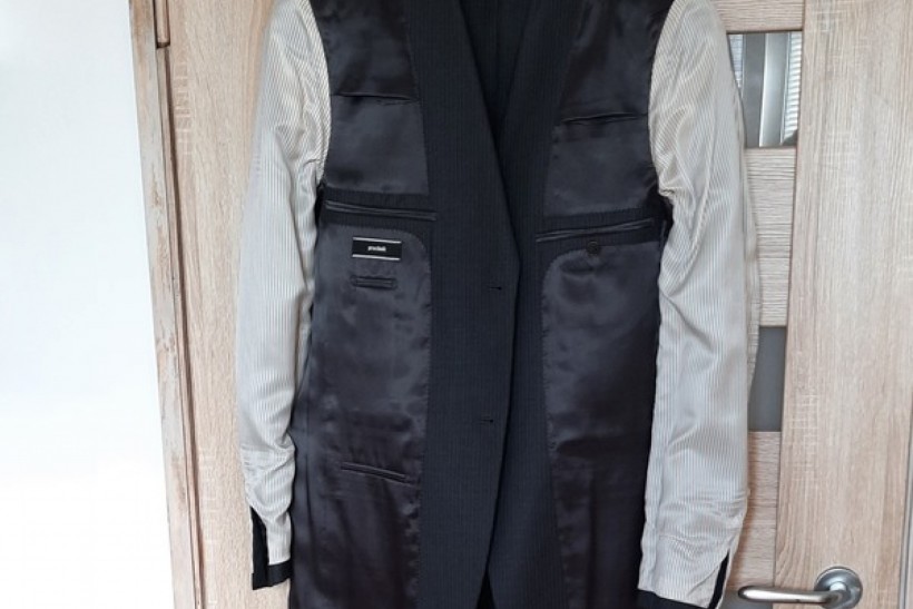 Cena 40 zł. Materiał: 95% wełna i 5% poliester; na 182 cm wzrostu (182 / 96 / 82), długość rękawa ok. 69 cm, zapinana na 2 guziki, w klapie butonierka; z przodu posiada jeszcze fabrycznie zszyte: kieszonkę na poszetkę oraz dwie kieszenie zewnętrzne z patkami; wewnątrz 4 kieszenie, z tyłu marynarki dwa rozcięcia (również zafastrygowane fabrycznie), całość na doskonałej jakości podszewce. Zakupiona w sklepie firmowym, wykonana z niezwykłą starannością, bardzo elegancka, pasuje do różnych stylizacji, całoroczna.
