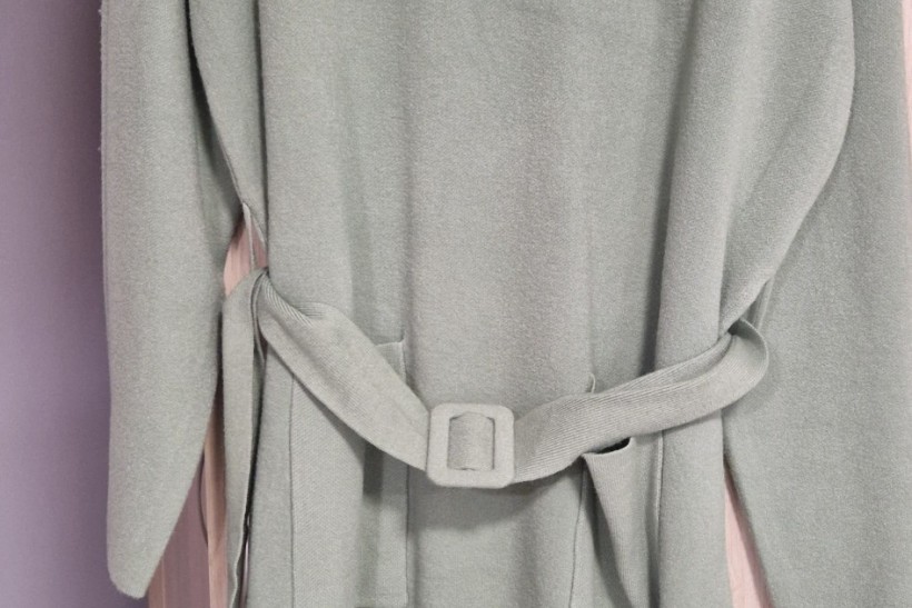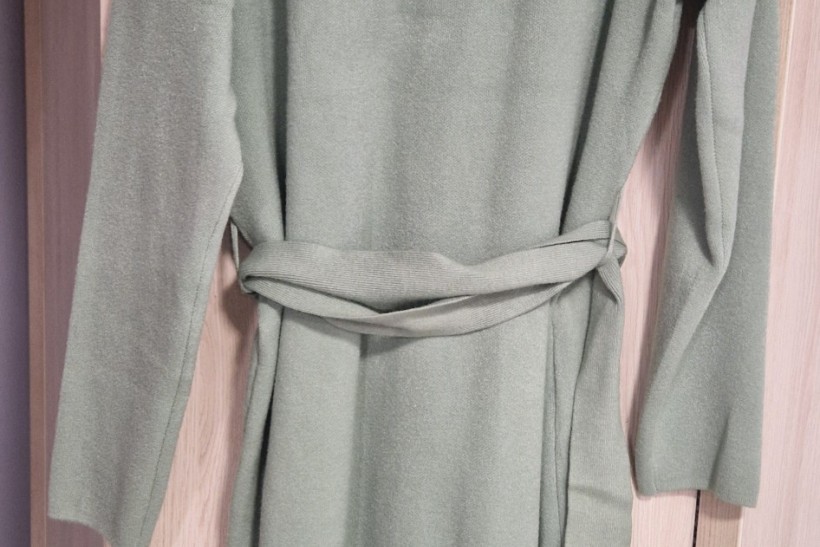 Materiał to, dzianina lub jak sweter. Jest to sukienka o prostym kroju, z długimi rękawami i okrągłym dekoltem. Długość sięga mniej więcej do kolan, może trochę za kolana. Posiada materiałowy pasek z klamrą oraz dwie naszywane kieszenie z przodu na wysokości bioder.