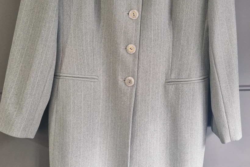 Ten prawie nowy komplet to spodnie i przedłużana marynarka, może płaszczyk. Kilka razy założone. W stanie bardzo dobrym. Wymiary marynarki to: dl 84, Szer ramion 38.
