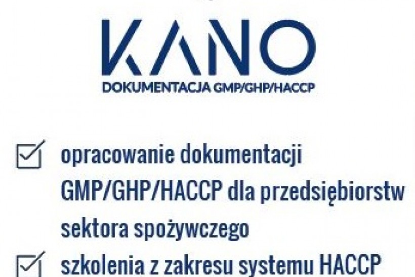 Głównym celem firmy KANO jest wsparcie oraz ułatwienie przedsiębiorcom prowadzenia działalności związanej z produkcją, przetwarzaniem, magazynowaniem bądź dystrybucją żywności. Specjalizujemy się w tworzeniu dokumentacji GMP/GHP/HACCP. Ponadto oferujemy szkolenia z zakresu systemu HACCP.